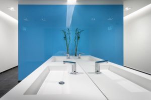 Designul oferit clădirii de birou a fost unul inovativ, accentul fiind pus și pe zona băii. Dezvoltatorul a avut la dispoziție, o gamă variată de concepte KUMA, dintre care l-a ales pe cel cu care a simțit că se identifică cel mai bine. Pentru realizarea lavoarului, în primul rând a ales o formă de bazin. Mai apoi, a trecut la alegerea materialului. Dezvoltatorul a ales lavoarul KUMA cu boluri multiple (4 boluri RONDO 35), turnate în suprafață continuă cu blatul și cu o lungime de 360 cm. Deoarece KUMA are posibilitatea personalizării dimensiunii lavoarelor de până la 420 cm turnate dintr-o singură bucată, conceptele sale sunt o alegere firească pentru dezvoltatori.