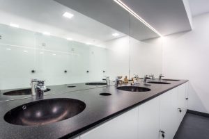 Culoarea aleasă pentru acest proiect a fost Galaxy (negru), culoare care conferă un plus de eleganță spațiului. Lavoarul a fost realizat din Rector (material marcă înregistrată KUMA), un material turnat, produs prin tehnologia Solid Surface, cu o suprafață elegantă, mat-satinată. Turnat într-o frumoasă suprafață omogenă matăsoasă, materialul este rezistent la substanțele chimice și împiedică dezvoltarea bacteriană. Materialul Rector este o rețetă proprie KUMA. Unul dintre atuurile KUMA este acela că lavoarul și blatul sunt turnate în suprafață continuă și nu prin prelucrare și alipiri ca alte materiale. În plus, Solid Surface previne acumularea de murdărie și facilitează curățarea. Un aspect esențial pentru spațiile publice. Pentru accesorizarea lavoarului s-a optat pentru un decupaj pentru coșurile de gunoi în blat. Pentru acest proiect, proiectantul a ales ca montajul lavoarelor să se realizeze pe mobilier, pentru a câștiga spațiu și a asigura o zonă de depozitare generoasă.