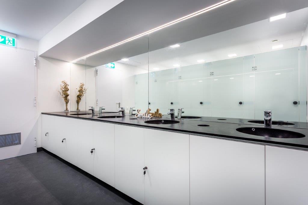 Identitatea puternică a colecţiei de lavoare KUMA dată de elementele estetice şi funcţionale, au plasat acest brand în topul preferințelor dezvoltatorului. Interesul pentru un design atractiv și funcțional este vizibil. Dezvoltatorul a ales pentru acest proiect lavoarele KUMA cu boluri multiple (două și trei boluri SQUARE 70), blatul fiind turnat în suprafață continuă cu bolul. Unul dintre modelele alese este realizat din marmura albă KUMA cu finisaj semigloss. Marmura KUMA este un material compozit turnat, de o calitate înaltă, obținut dintr-un mix de granule de marmură naturală combinate cu rășini poliesterice. Partea exterioară este acoperită cu un gelcoat sanitar, fără pori, menit să ofere o rezistență ridicată, impermeabilitate dar și proprietăți antibacteriene. Materialul se curăță și se întreține ușor. Suprafața finisată semigloss, prezintă și avantajul de a nu scoate deloc în evidență micile zgârieturi ce apar inerent în cazul uzului zilnic, specific spațiilor publice.